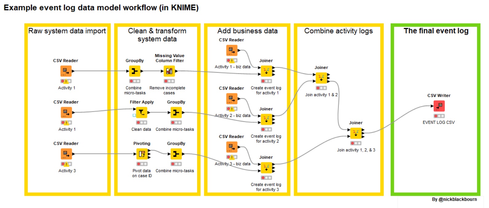 If you use a low-code analytics workbench solution like KNIME, creating event logs can become even less of a technical challenge. This has the added benefit of making your data model more accessible to other stakeholder groups as you build your organisation’s process mining capability.